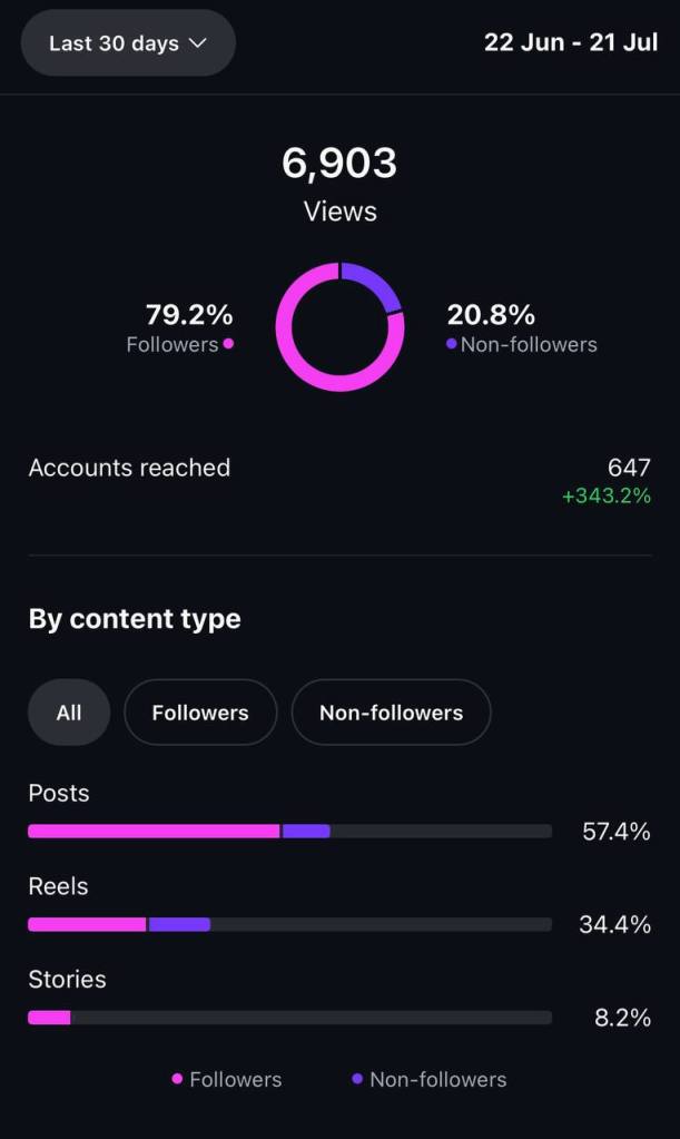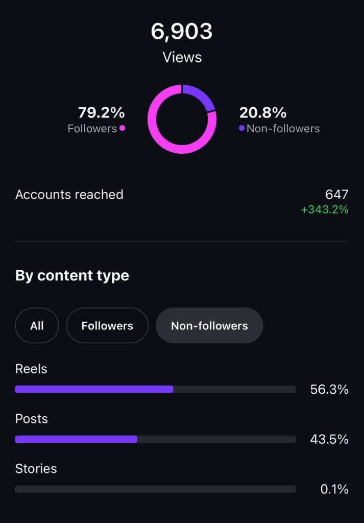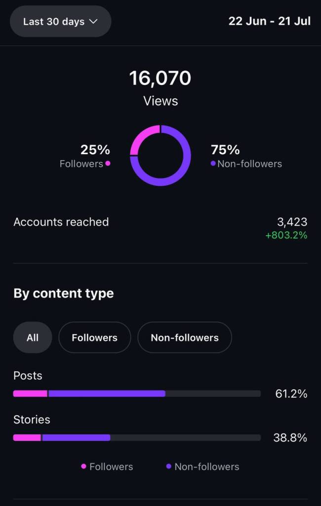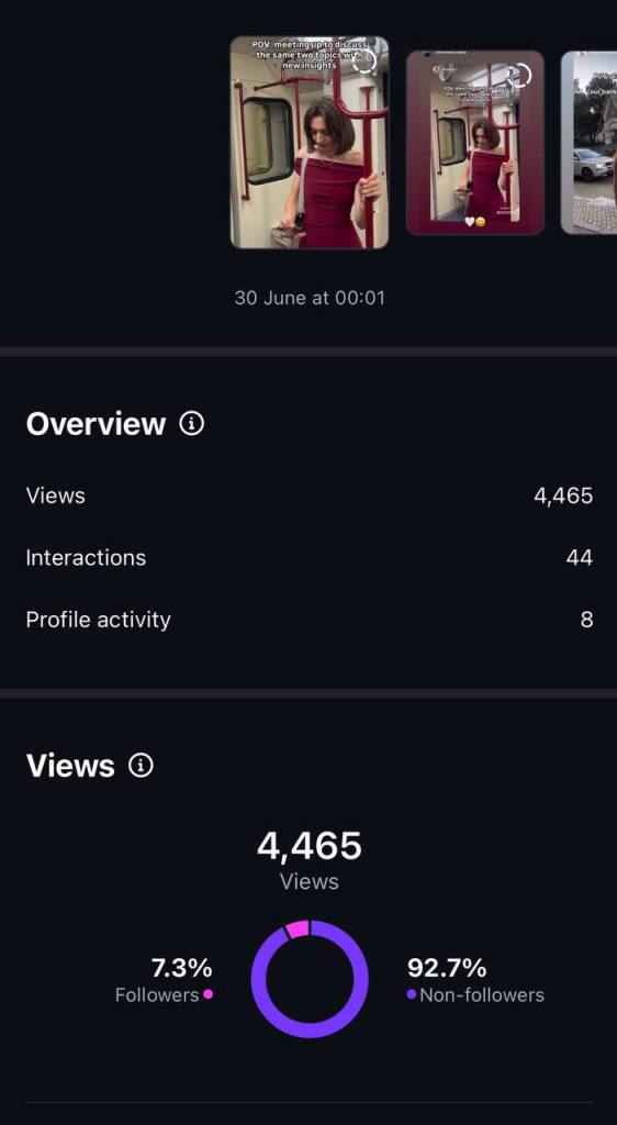 Here’s some progress I’ve made in the past month with my personal instagram account. I created my first-ever Reel, inspired by the trending “POV-style” format. I believe it performed well because I used a trending audio and the original creator who started the trend noticed and engaged with my content. I only shared it as a Story, it expired after 24 hours, and I didn’t publish it as a post either: